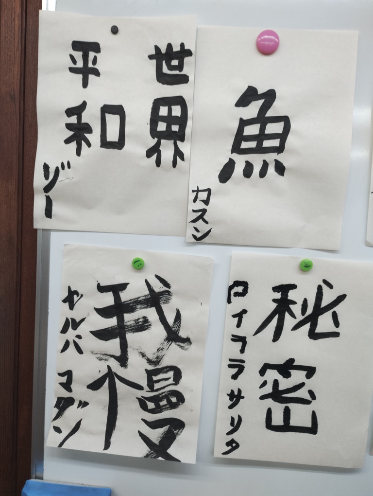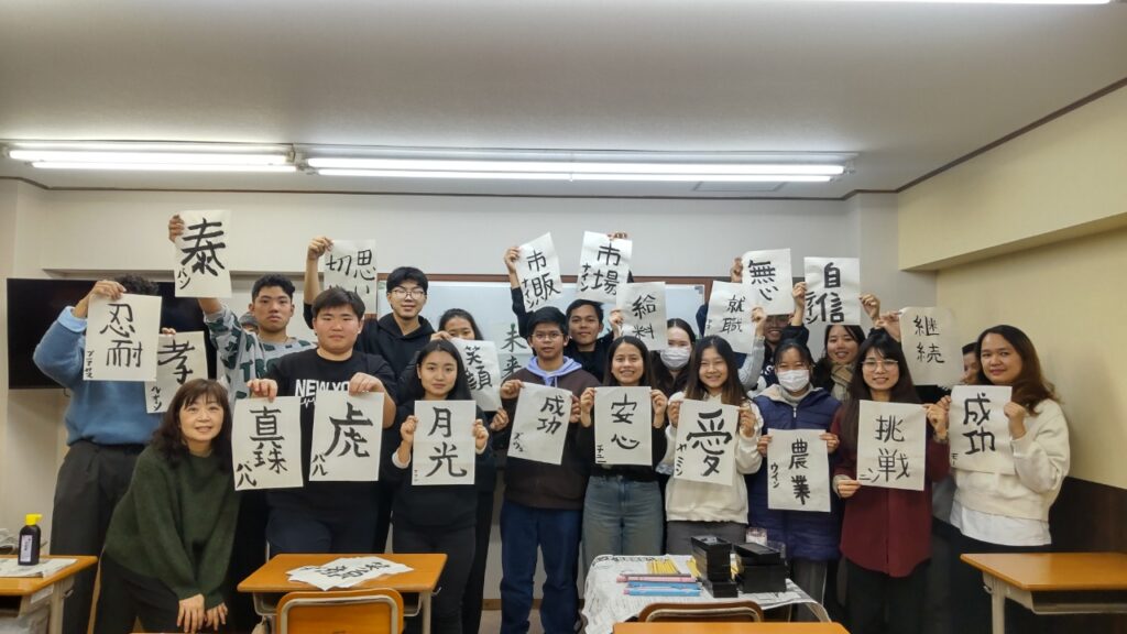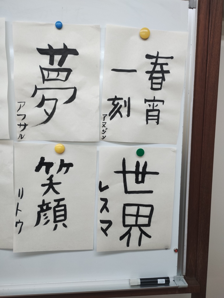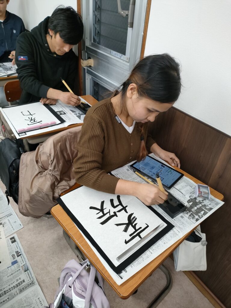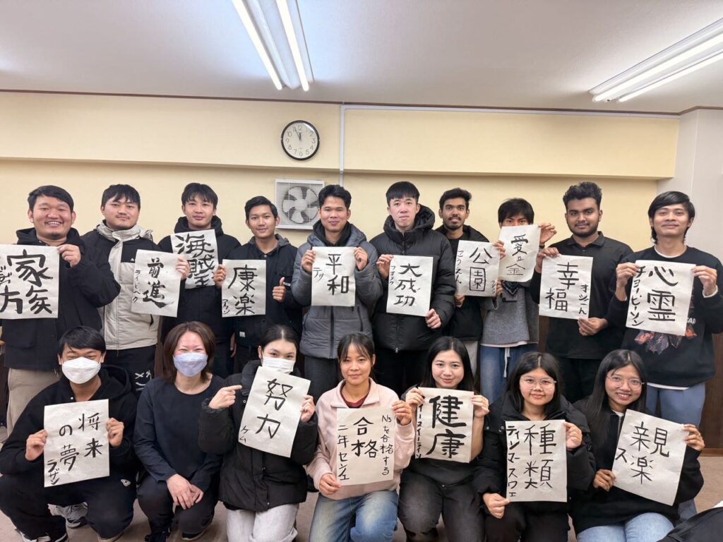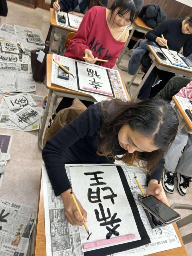 『書き初め』とは、新年の抱負や願いを文字に込める日本の伝統行事です。今年も学生たちは、それぞれの想いを胸に、真剣な表情で好きな言葉を書き上げました。書いた後にその言葉の意味や選んだ理由を1人ずつ話してもらいました。