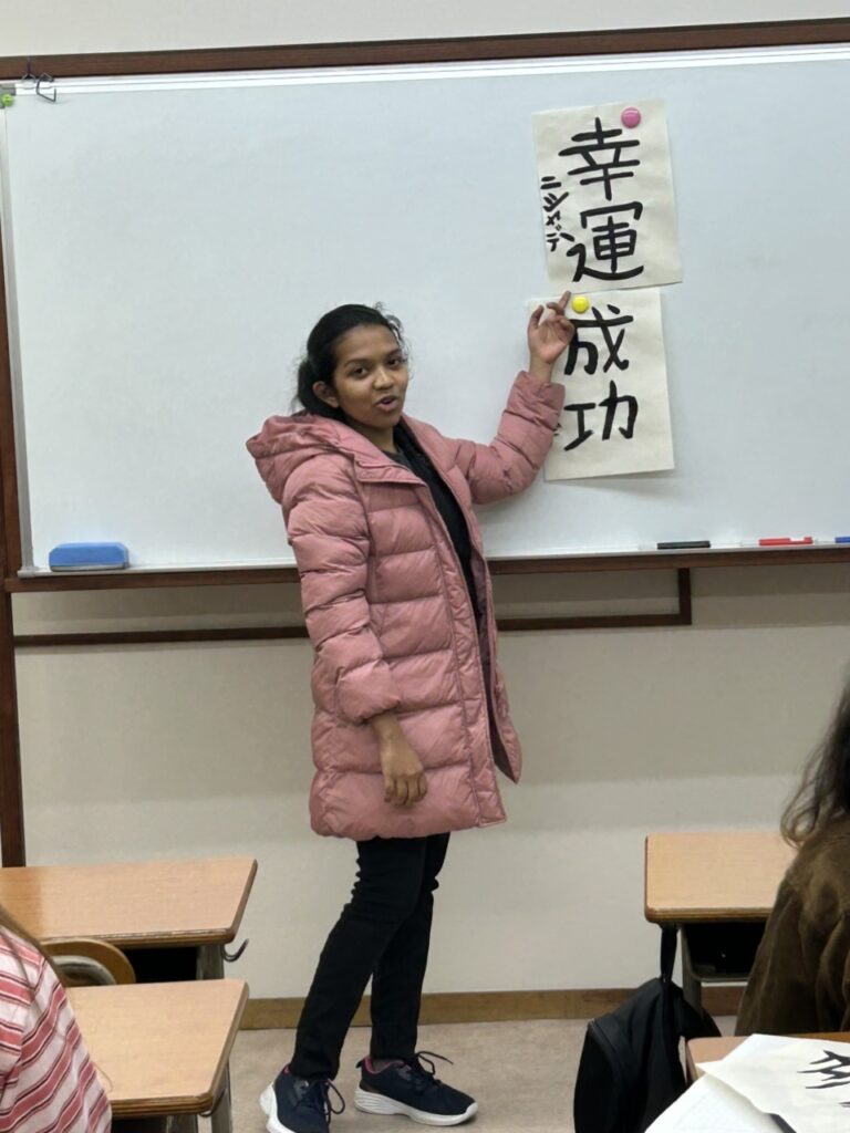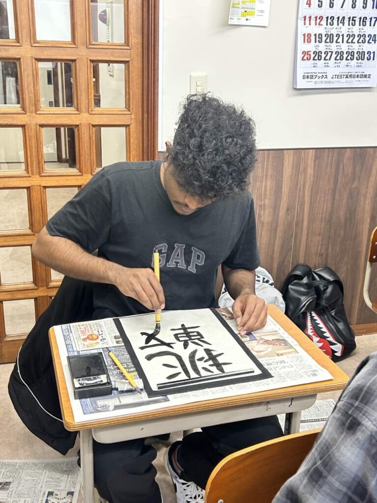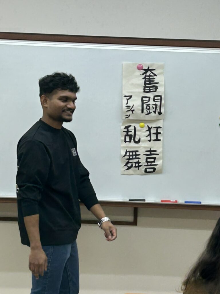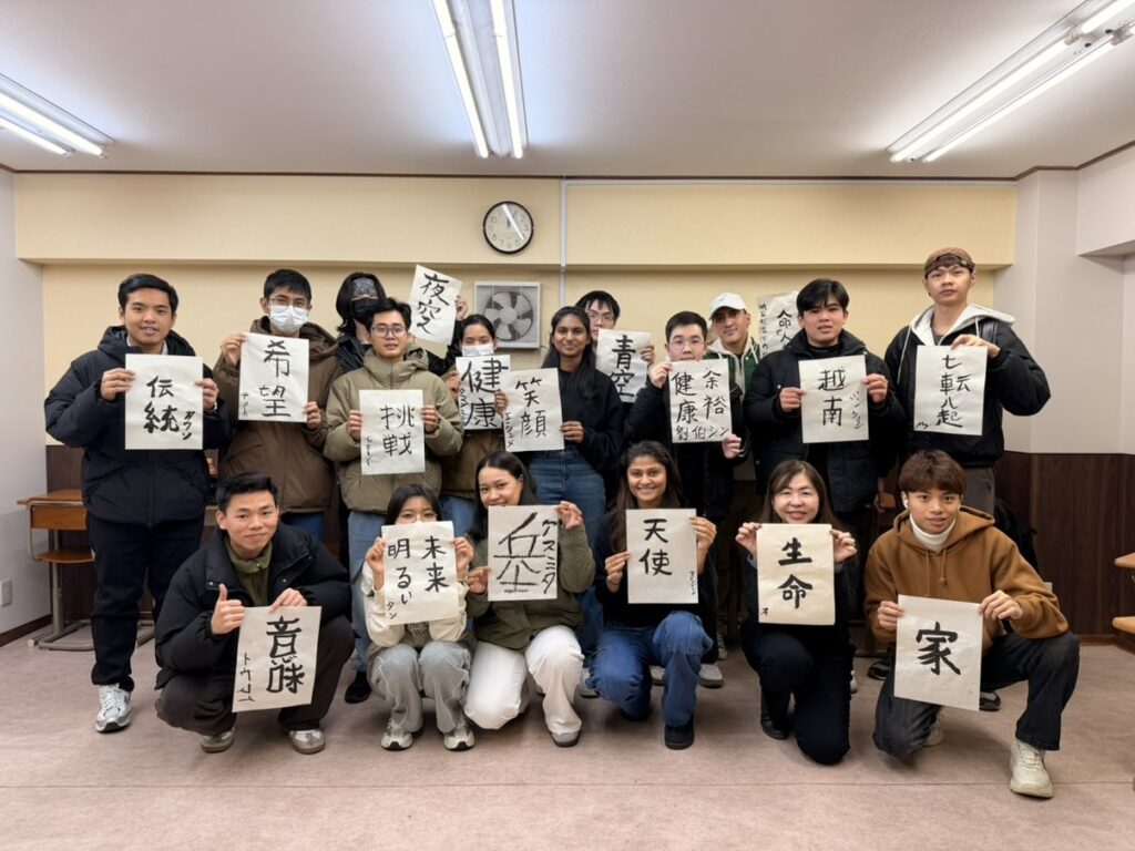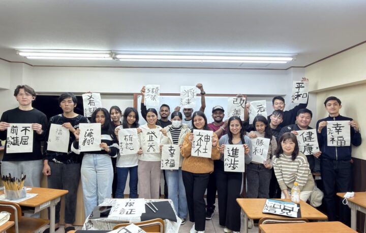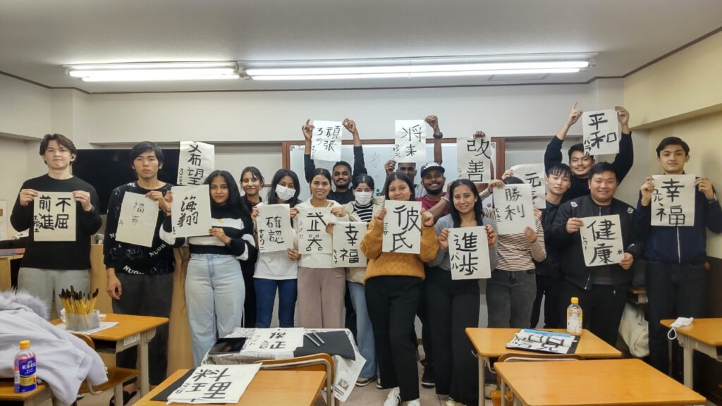 『書き初め』とは、新年の抱負や願いを文字に込める日本の伝統行事です。今年も学生たちは、それぞれの想いを胸に、真剣な表情で好きな言葉を書き上げました。書いた後にその言葉の意味や選んだ理由を1人ずつ話してもらいました。